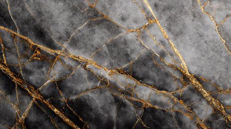 Splendid breccia or marble with a golden earthquake-like crack in a digital art generative AI. Modern abstract background of black marble hat has been eroded to reveal shiny golden cracks.
