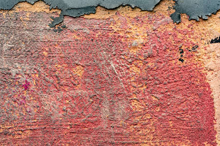 Detailed and colorful close up at cracked and peeling paint on concrete wall textures in high resolution.