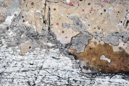 Closeup image showing the textures and colours of peeling paint on cement