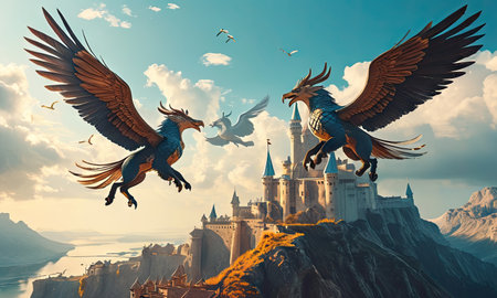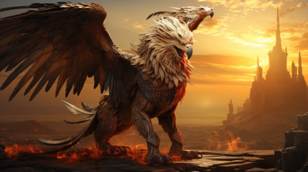 Majestic Griffin Overlooking Castle at Sunset