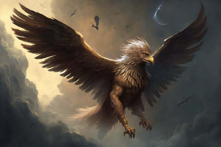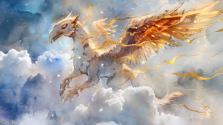 a griffin soaring through the clouds, its wings spread wide, created with generative ai
