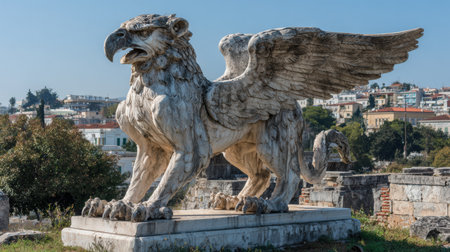 Griffin on stone ruins overlooks the landscape. Its wings spread wide while it represents protection in Greek culture.