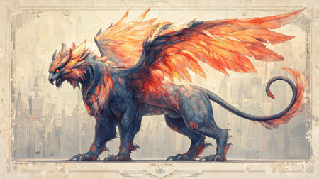 A winged lion with a fiery tail stands on a rock, its wings spread wide in a dramatic pose