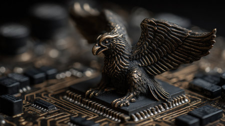 An ornate eagle sculpture, crafted from metallic materials, rests atop a detailed computer circuit board. The image presents a shallow depth of field, focusing on the bird and its intricate details. The lighting suggests a studio environment, potentially suitable for commercial purposes or editorial use focusing on technology themes.