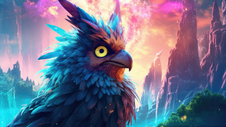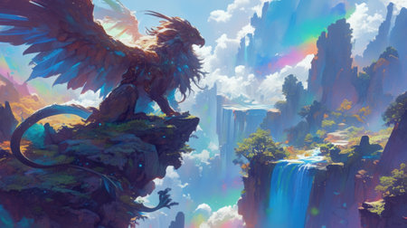 A mystical mystical creature with the head of a lion the body of an eagle and the tail of a serpent perched atop a mystical rainbowcolored waterfall in a hidden valley