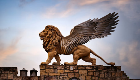 A magnificent winged lion perches atop a stone wall, exuding power against a colorful dusk sky.