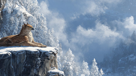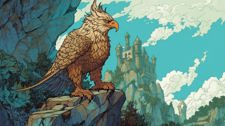 A griffin perched on a cliff. Fantasy concept, Digital art style.
