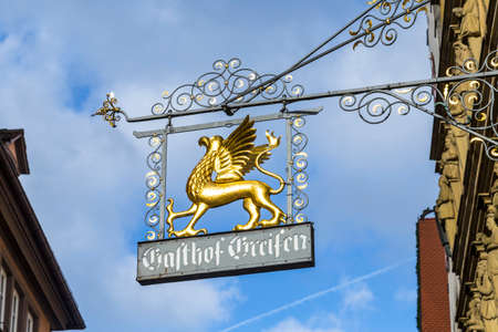 Rothenburg ob der Tauber, Germany - January 15, 2014: Medieval shop sign of a restaurant in Rothenburg ob der Tauber under blue sky.