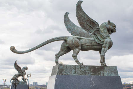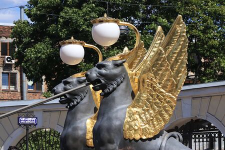 Russia, Petersburg, June 29, 2019. Winged lions on the Bank Bridge. Griffins on the bank of the bridge over the Fontanka River, according to legend, protect the golden treasures, and those who touch them will become rich