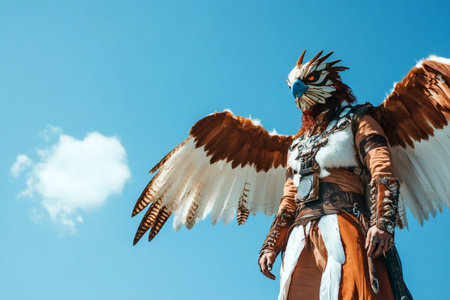 Street artist wearing handcrafted eagle wings and mask posing under a blue sky with some clouds