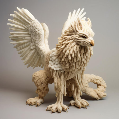 the majestic knitted griffin, with its intricately woven fur and regal demeanor, stands proudly against a crisp white background, showcasing its full body in all its textile glory, perfect for fans of fantasy creatures and handmade crafts. ai generated