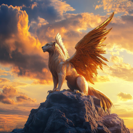 A majestic creature with the body of a lion and large golden wings stands on a rocky surface. The backdrop features a stunning sunset with colorful clouds, creating a magical atmosphere.
