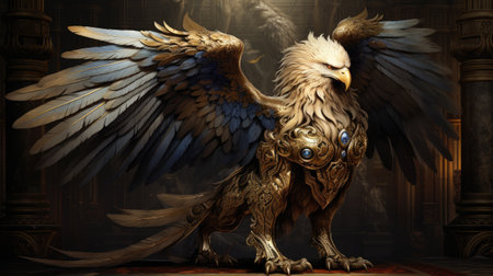 highly detailed portrait captures golden winged griffin poised its muscular lion body Its amber eyes and open beak suggest powerful presence