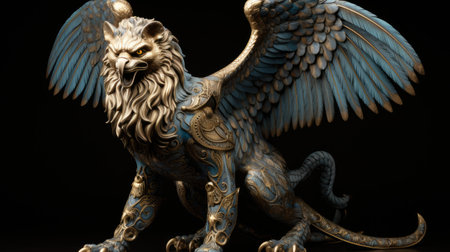 Winged lion sculpture with intricate patterns and fiery accents. Set against a dark background creating a dramatic effect. Concept of fantasy art, creative design, decorative items.