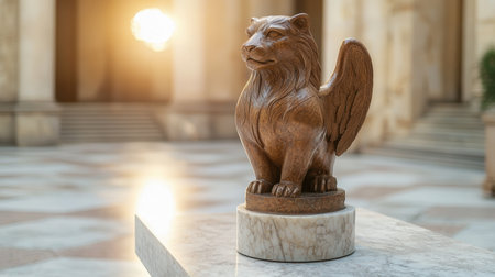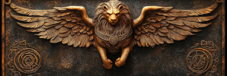 Winged lion sculpture prominently displayed against textured backdrop. Ornate design captures fine details in bronze hues, enhancing visual appeal.