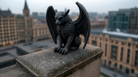 Gargoyle statue overlooks an old European city skyline.