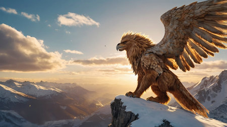 A griffin with a lion's body and golden wings perches proudly on a rocky peak as vibrant colors of the sunset fill the sky, creating a breathtaking display of nature's beauty.