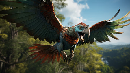 the tengu hybrid, a mythical creature with human and bird-like features, is majestically captured in this stunning portrait photograph, showcasing its vibrant plumage, sharp talons, and piercing gaze, blending japanese folklore with fantasy elements in a mesmerizing visual representation. ai generated