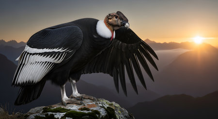 A majestic Andean condor perches proudly on a moss-covered rock, its impressive wings partially spread, against the stunning backdrop of a mountain range at sunset. The warm, golden light illuminates the magnificent bird, capturing its power and the serene beauty of its high-altitude home.