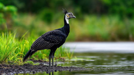 A Horned Screamer Anhima cornuta standing at the edge of a water body surrounded by lush green vegetation, showcasing its distinctive black plumage, white markings, and unique horn-like structure on its head in its natural wetland habitat.