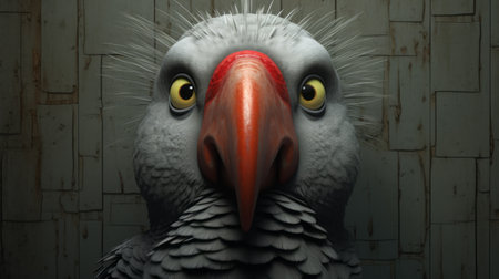 an avian bird with striking orange eyes is depicted in this graphic illustration. the artwork showcases the bird in a style rendered in cinema4d, featuring imaginative prison scenes and photorealistic portraiture. the piece also incorporates elements of bombacore and neo-concrete art, presenting a captivating fusion of styles. additionally, the illustration includes fantastic creatures, adding an element of fantasy to the composition. rendered in maya, this