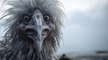 a eyeless creature, resembling a grotesque caricature, is featured in this national geographic-style photo. rendered in cinema4d with life-like avian illustrations, the creature's unique appearance is captured in stunning 32k uhd resolution. its poodlepunk gray color adds to its intriguing and mysterious presence. ai generated