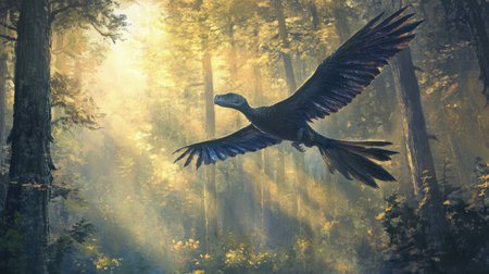A large, dinosaur-like creature with feathers soars gracefully through a lush forest filled with tall trees. Sunlight filters through the leaves, creating a serene atmosphere.