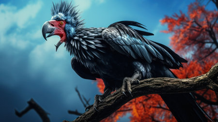 A majestic California Condor soars against a breathtaking autumn landscape Vibrant golden foliage paints the mountainous backdrop, creating a scene of unparalleled beauty This captivating image is a testament to the wonders of nature and the grace of these magnificent birds Perfect for nature enthusiasts and wildlife photographers AI Generative