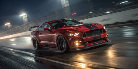 high speed red sports car drifting on wet racetrack at night with motion blur and glowing lights