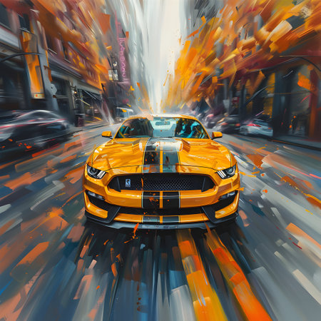 Yellow sport car with motion blur on the road. Digital painting.