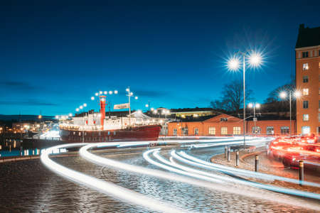 Helsinki, Finland. View Of Police Harbor Merikasarmin Laituri And Laivastokatu Street In Evening Night Illuminations
