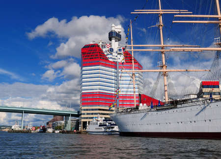 Gothenburg, Sweden - October 17, 2019: Gothenburg harbor with a vessel and the building Läppstiftet