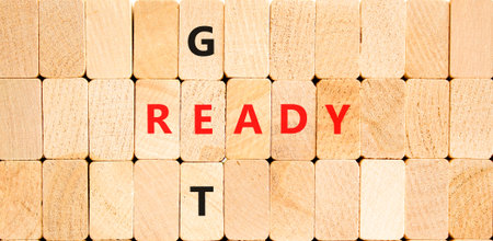 Get ready symbol. Concept words Get ready on beautiful wooden block wall. Beautiful wooden block wall background. Wooden blocks. Business, support, motivation and get ready concept. Copy space.