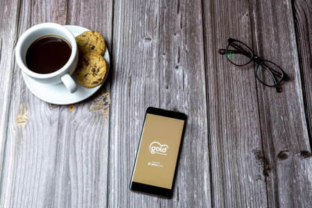 CHIANG MAI, THAILAND - May 18,2020: Flat lay of workspace desk and Apple iPhone 6s with Grab application on the screen. Grab is an app for transportation and delivery service.