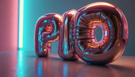 The image features shiny, metallic letters P10 reflecting vibrant hues of pink and blue, creating a modern and playful atmosphere. The glossy finish and dynamic lighting evoke a sense of celebration and creativity, making it perfect for festive occasions or branding.