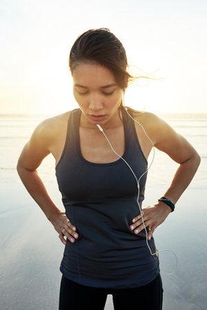 Tired, woman and earphones for fitness at ocean from exercise, listening to music and training recovery. Female athlete, fatigue and rest with streaming audio, marathon practice and workout burnout