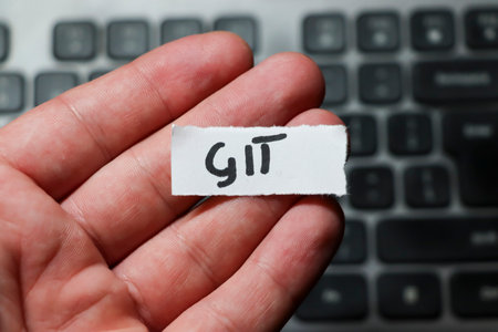 A hand holding a piece of paper with the handwritten word GIT symbolizing concepts like version control and coding with a keyboard in the background representing technology.