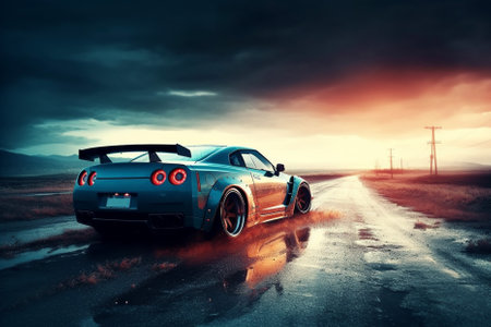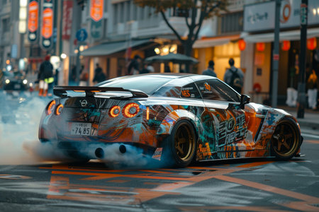 AIdriven sports car drifts on colorful urban street in futuristic setting. Concept Futuristic Cars, Sports Car Drifting, Urban Street, AI Technology, Colorful Setting