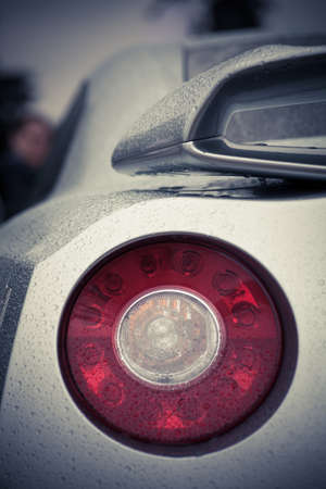 Detail on the rear light of a car on a rainy day.