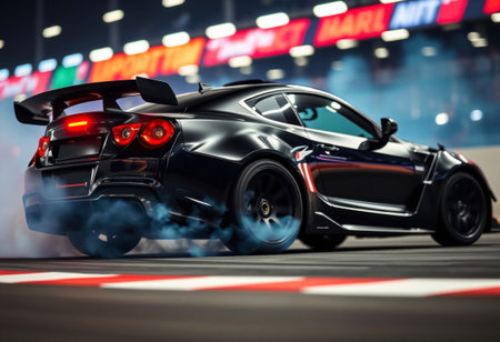 high speed drift car sliding through a sharp turn on a night racetrack with smoke and motion blur