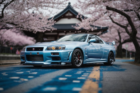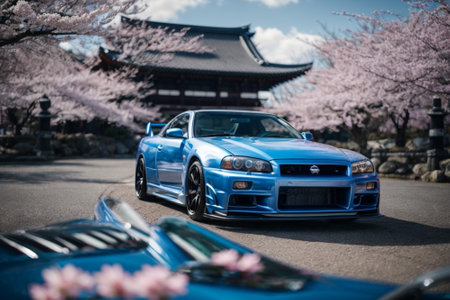 Cherry blossoms and blue car in Kyoto, Japan. Cherry blossom season is one of the most popular festivals in Japan.