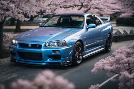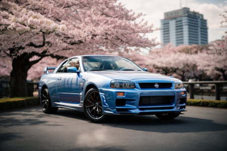 Japanese cherry blossoms in full bloom and blue car in the background