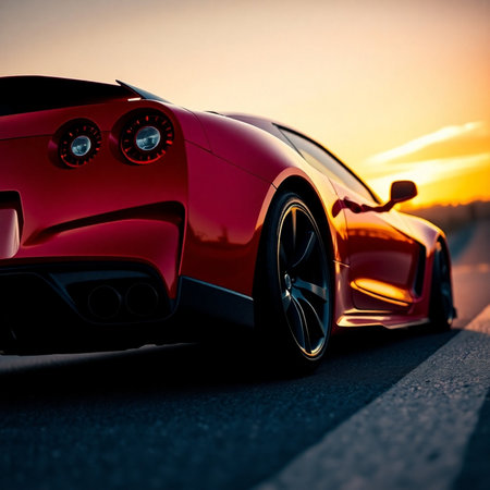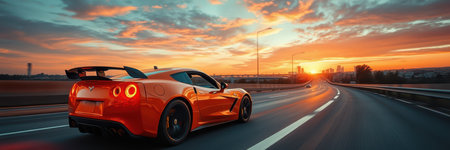 High-speed luxury sedan cruising along the highway during sunset, showcasing sleek design and power
