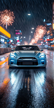 Sleek, light blue car speeding down rain-soaked city street with vibrant reflections and blurred fireworks in background. Atmospheric night scene. Sport, race competition, motorsport