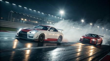 Two powerful sports cars perform an incredible synchronized drift on a wet track at night. Bright stadium lights illuminate the scene as smoke billows from the tires, creating an intense, action-packed motorsport display.