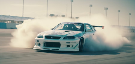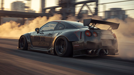 a heavily modified sports car performs a high speed drift on a racetrack. the vehicle features an aggressive widebody kit and massive rear wing while creating a thick cloud of tire smoke during sunset. perfect for automotive enthusiasts.