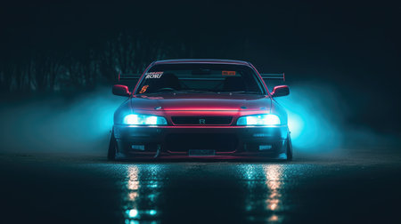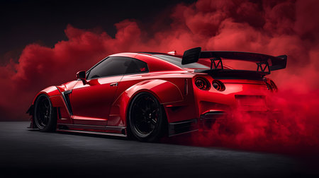 a stunning red performance car featuring a custom body kit and large rear wing. this modified vehicle is surrounded by dramatic red smoke, highlighting its aggressive and powerful design for automotive enthusiasts.