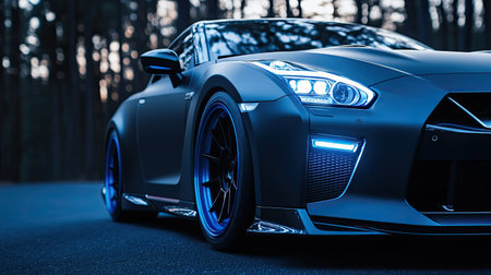 A striking black sports car parked on a dark road at dusk, surrounded by a forest. The glowing headlights add a modern touch to this powerful vehicle.