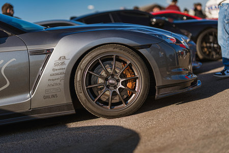 Imola, italy 01 january 2026: nissan gt-r r35 close-up of custom wheel, tire and performance decals at outdoor car meet, showing carbon details and brake kit