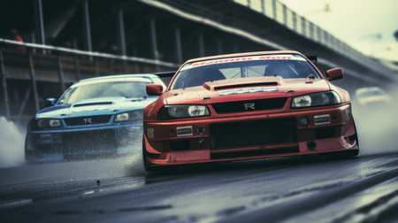 two 1990 nissan gt-r cars engage in intense racing, with drivers exchanging glances. sparks fly beneath them as they navigate a slightly wet track. the cinematic shot captures the reflections on one of the cars, adding to the dynamic atmosphere. shot on grainy medium format kodak portra 800 film with an smc takumar 105mm f/2.8 lens. ai generated